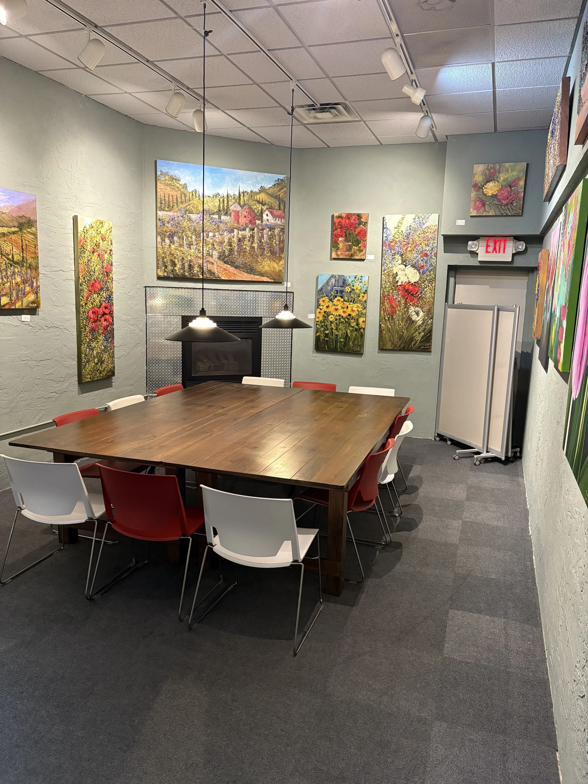 Tucked inside the gallery, our private room offers the perfect blend of warmth and style — a crackling fireplace, farm tables, comfortable modern seating, and walls lined with local art. Whether it’s an offsite meeting, bridal shower, or intimate dinner, this inviting space makes every occasion special. Available any day, 7 a.m.–11 p.m., for up to 16 guests.